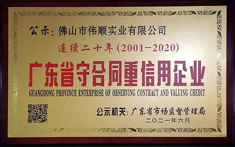 • 佛山市偉順實業(yè)有限公司被廣東省市場監(jiān)督管理局授予連續(xù)二十年(2001-2020)廣東省守合同重信用企業(yè)稱號。