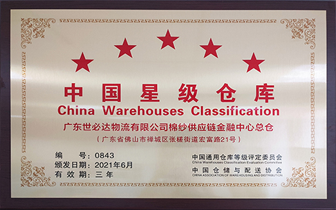 • 廣東世必達物流有限公司棉紗供應(yīng)鏈金融中心被中國倉儲與配送協(xié)會評定為中國五星級倉庫。